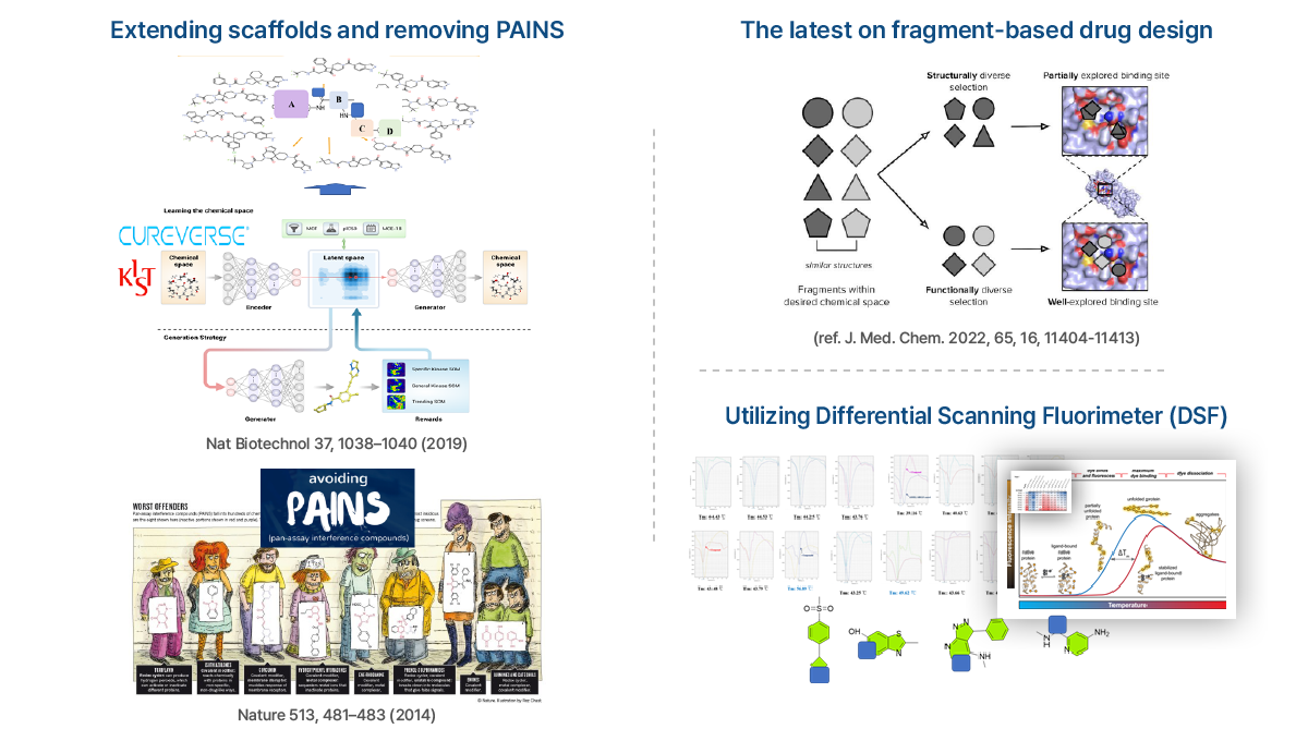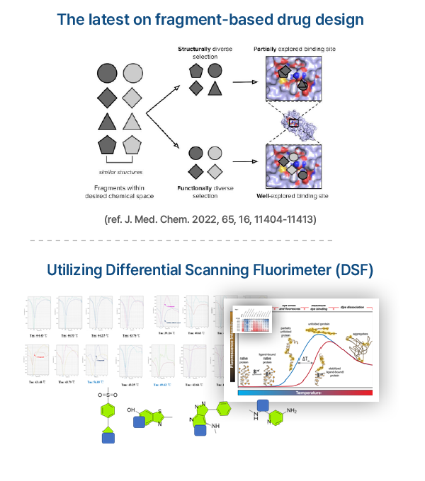 We have built a proprietary compound library with excellent efficacy, low toxicity, and high specificity by applying scaffold hopping technology. Additionally, we are developing optimized novel small molecule modulators for disease targets by utilizing the latest medicinal chemistry techniques such as Fragment-Based Drug Discovery (FBDD) and Differential Scanning Fluorimetry (DSF).