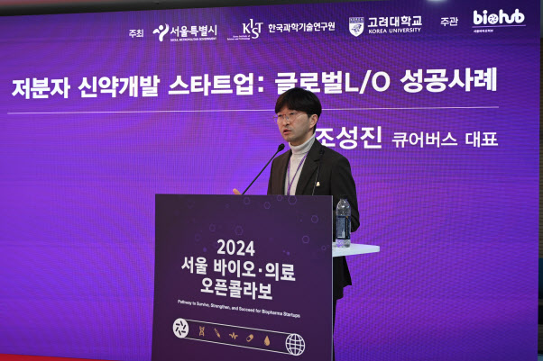 조성진 큐어버스 대표는 이날 ‘저분자 신약개발 스타트업: 글로벌 L/O(기술수출) 성공 사례’를 주제로 한 발표에서 “길고 아주 리스키(위험)한 신약 개발의 여정에서 저희는 임상 1상 정도에서 임상 2상 초기까지의 앞부분 수행 개발 스타트업”이라며 “2021년 10월에 창업을 했는데, KIST의 출자 기술을 가지고 시작해 KIST 대표 연구소 기업”이라고 회사를 소개했다.